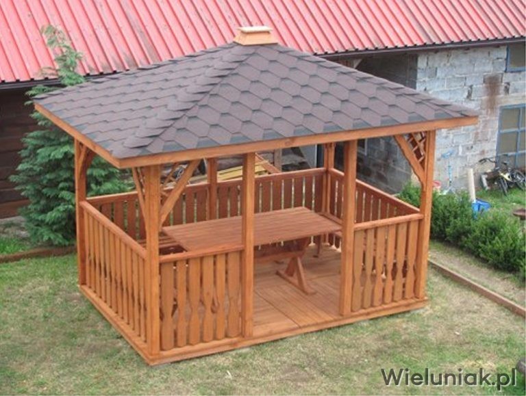 Altany ogrodowe wykonywane są z drewna sosnowego. Każda altana drewniana jest ustawiana na odpowiednio rozmieszczonych i wypoziomowanych podkładach betonowych, które zabezpieczają przed gromadzeniem się wody pod podłogą altany i zapewniają cyrkulację powietrza pod podłogą. Stosujemy również agrowłókninę, której zadaniem jest zapobieganie przerastaniu roślinności między deskami podłogowymi. Słupy altany mają wysokość 200 cm, natomiast całkowita wysokość altany wynosi 270 cm. Dachy altan wykonane są z desek boazeryjnych oraz pokryte gontem bitumicznym co zapewnia długoletnią trwałość każdej altany oraz odpowiednie wrażenia estetyczne. Każda z altan wyposażona jest w zestaw mebli, na który składają się stół prostokątny oraz 5 ławek, zamocowanych do altany. Wszystkie elementy altany są odpowiednio strugane oraz dwukrotnie impregnowane. Na życzenie klienta możemy zamontować w altanie oświetlenie oraz dodatkowe kratownice. Wszystkie altany montujemy samodzielnie. Dostarczamy nasze produkty na terenie Polski oraz zagranicę. Koszty transportu uzgadniamy indywidualnie z każdym klientem.