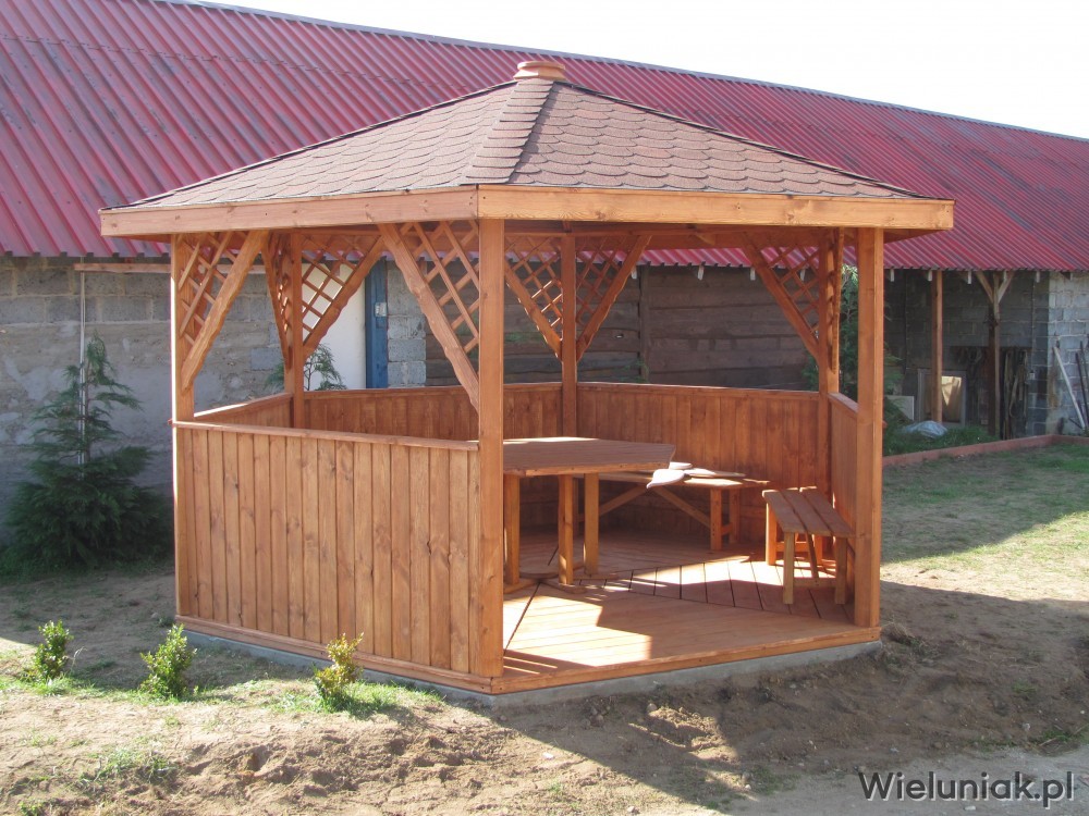 Altany ogrodowe wykonywane są z drewna sosnowego. Każda altana drewniana jest ustawiana na odpowiednio rozmieszczonych i wypoziomowanych podkładach betonowych, które zabezpieczają przed gromadzeniem się wody pod podłogą altany i zapewniają cyrkulację powietrza pod podłogą. Stosujemy również agrowłókninę, której zadaniem jest zapobieganie przerastaniu roślinności między deskami podłogowymi. Słupy altany mają wysokość 200 cm, natomiast całkowita wysokość altany wynosi 270 cm. Dachy altan wykonane są z desek boazeryjnych oraz pokryte gontem bitumicznym co zapewnia długoletnią trwałość każdej altany oraz odpowiednie wrażenia estetyczne. Każda z altan wyposażona jest w zestaw mebli, na który składają się stół z sześciokątnym blatem oraz 5 ławek, zamocowanych do altany. Wszystkie elementy altany są odpowiednio strugane oraz dwukrotnie impregnowane. Na życzenie klienta możemy zamontować w altanie oświetlenie oraz dodatkowe kratownice. Wszystkie altany montujemy samodzielnie. Dostarczamy nasze produkty na terenie Polski oraz zagranicę. Koszty transportu uzgadniamy indywidualnie z każdym klientem.