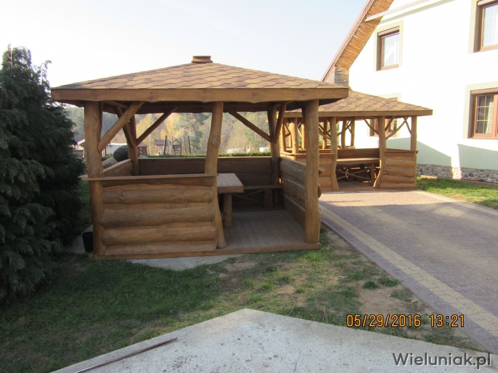 1.Słupy altany wykonane z bali z możliwą naturalną krzywizną o średnicy ok. 16 cm.