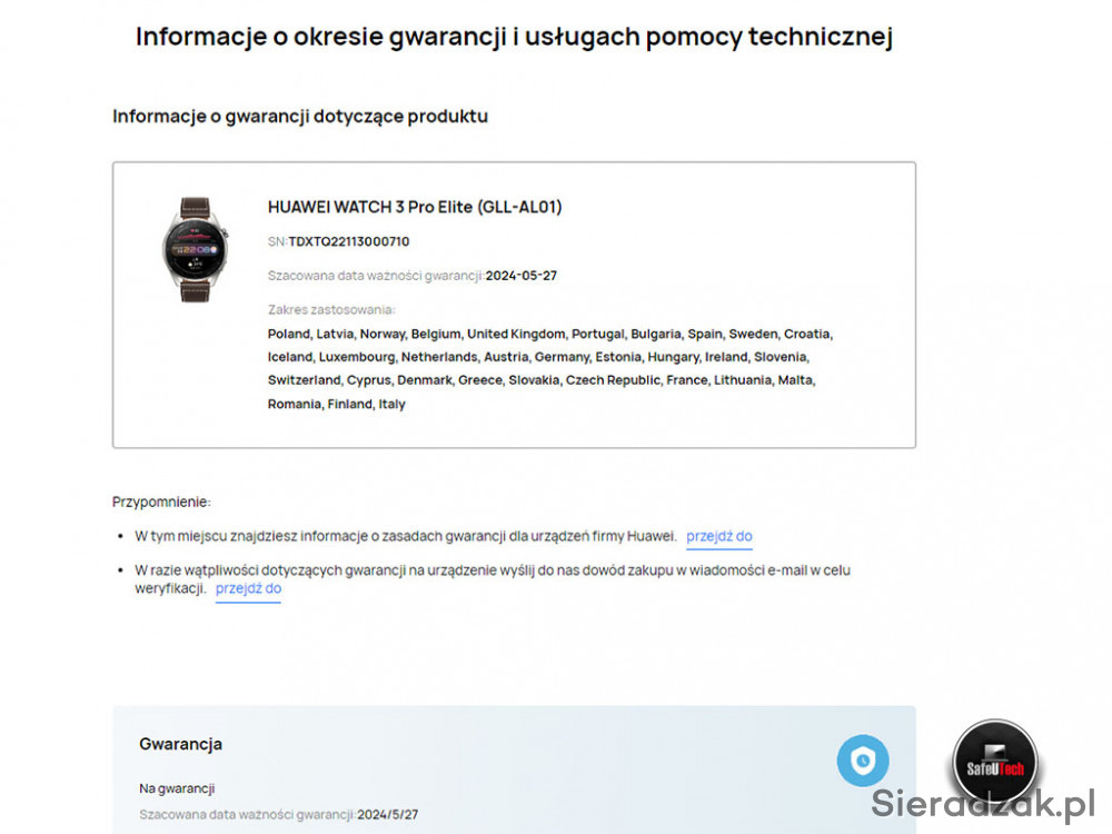WG. NR SERYJNEGO ZEGAREK NA GWARANCJI PRODUCENTA DO 27 MAJA 2024 ROKU. NIESTETY NIE POSIADAMY PIERWOTNEGO DOWODU ZAKUPU - WG. INFOLINII HUAWEI NIE JEST WYMAGANY.