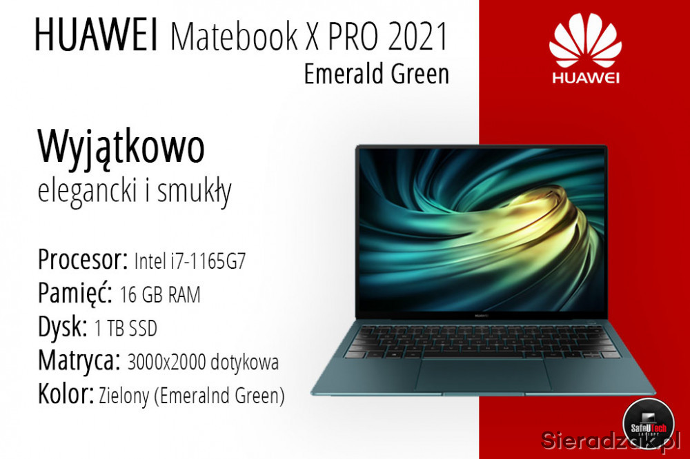 Do sprzedania oferujemy WYJĄTKOWO PIĘKNEGO, ZIELONEGO Huawei Matebook X Pro 2021 w najmocniejszej konfiguracji w kolorze ZIELONYM z czterordzeniowym procesorem Intel i7-1165G7, 16 GB RAM, dyskiem SSD 1 TB, zintegrowaną kartą graficzną Intel Iris Xe, 2xUSB-C z Thunderbolt 3, USB 3.0, HDMI, BLUETOOTH, bardzo dobrej jakości ekranem dotykowym w rozdzielczości 3000x2000, podświetlaną klawiaturą, czytnikiem linii papilarnych oraz mocną baterią.