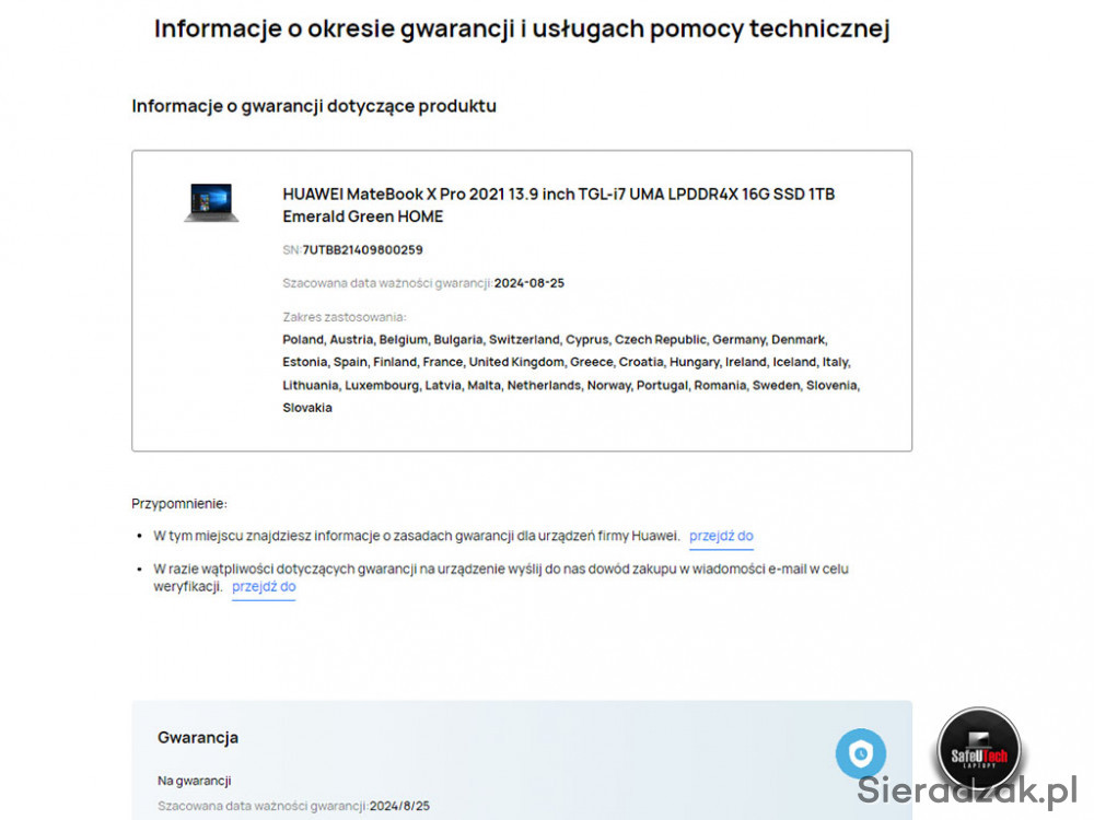 WG. NUMERU SERYJNEGO NA WAŻNEJ GW. PRODUCENTA DO 25 SIERPNIA 2024 ROKU - NIESTETY NIE POSIADAMY PIERWOTNEGO D O W O D U Z A K U P U. WG. INFOLINII HUAWEI (MOŻNA SAMEMU POTWIERDZIĆ) NIE JEST ON WYMAGANY W PRZYPADKU SPRZĘTU Z POLSKIEJ DYSTRYBUCJI. SAMI SWOJEGO PRYWATNEGO HUAWEI'A WYSŁALIŚMY NA GWARANCJĘ CELOWO BEZ D O W O D U Z A K U P U - ZOSTAŁ NAPRAWIONY W CIĄGU DWÓCH DNI BEZ ŻADNYCH PYTAŃ O D O W Ó D Z A K U P U. PRODUCENT I SERWIS SPISAŁ SIĘ NA MEDAL.