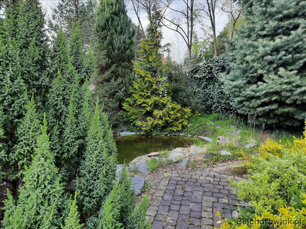 Teren wokół domu zagospodarowany: drzewa i krzewy ozdobne, oczko wodne, przejścia wyłożone kostką.