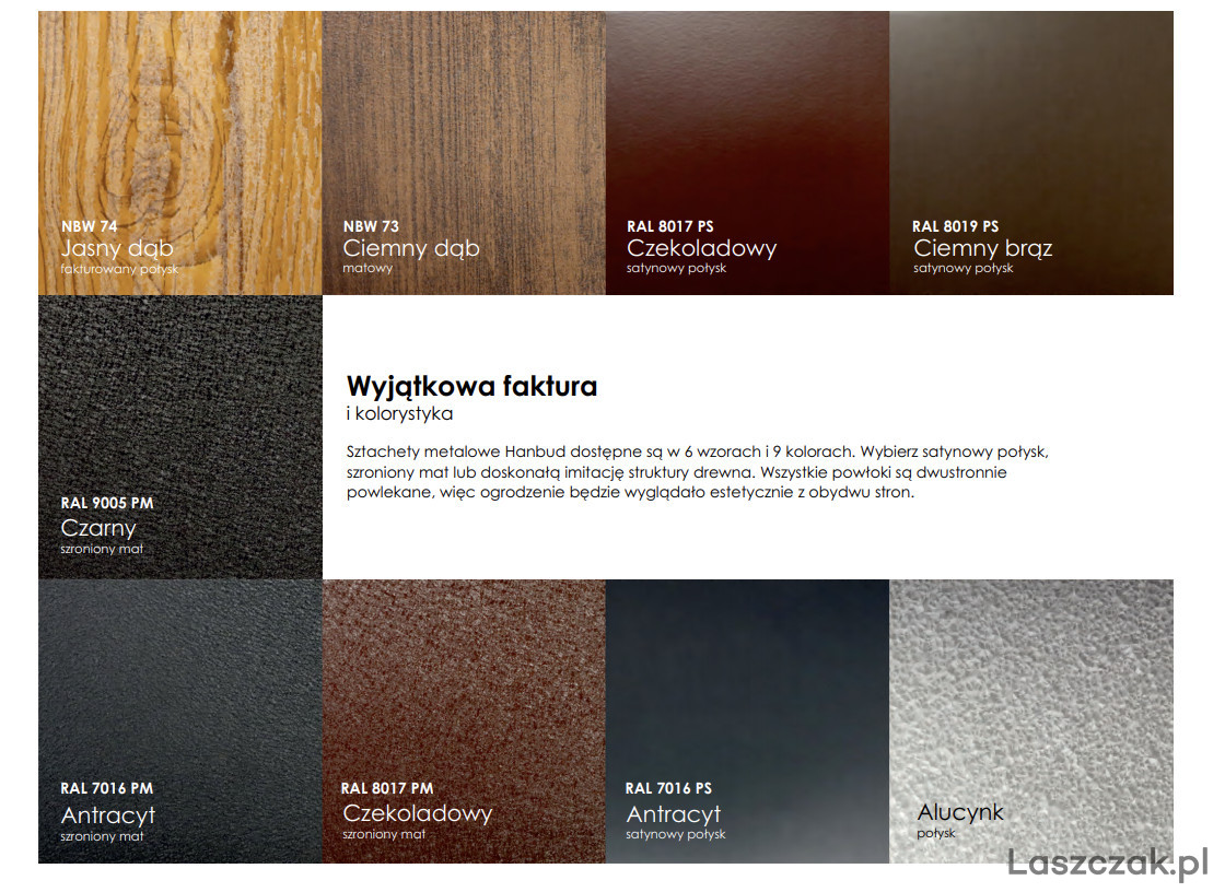 Sztachety również dostępne w powłoce matowej oraz drewnopodobnej ciemny dąb