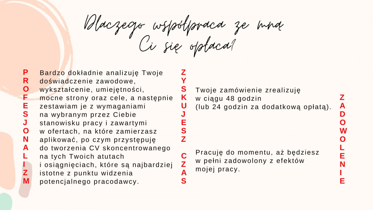 Napiszę dla Ciebie skuteczne CV (otrzymasz je w formacie pdf oraz w wersji edytowalnej), które zwiększy Twoje szanse na szybkie znalezienie wymarzonej pracy i zaoszczędzi Ci sporo czasu.