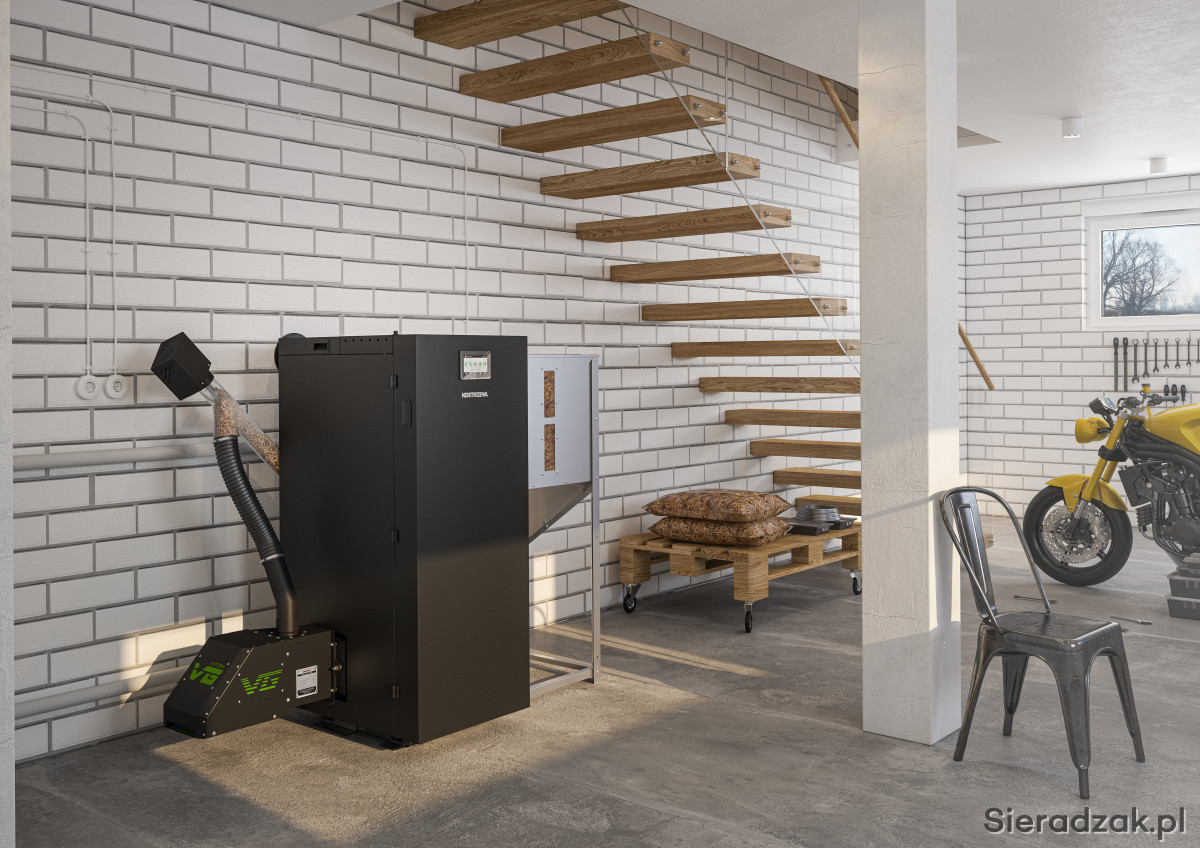 Kocioł z zabudowanym palnikiem, zbiornikiem i podajnikiem paliwa zamknięty w postaci jednej bryły o nowoczesnej formie. Kompaktowy kształt o niewielkich gabarytach sprawia, że idealnie nadaje się do małych kotłowni.