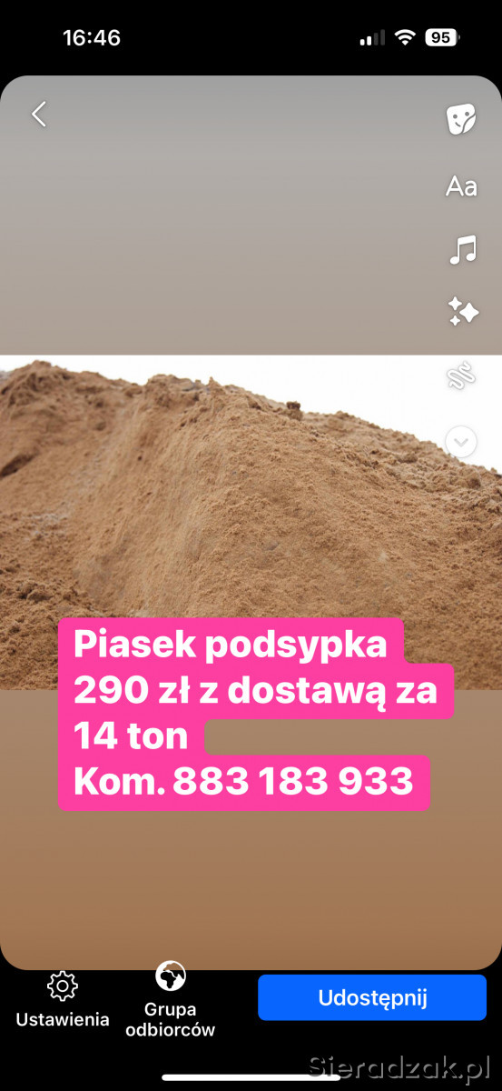piasek podsypkę z dostawą 14 ton w kwocie 290 zł
