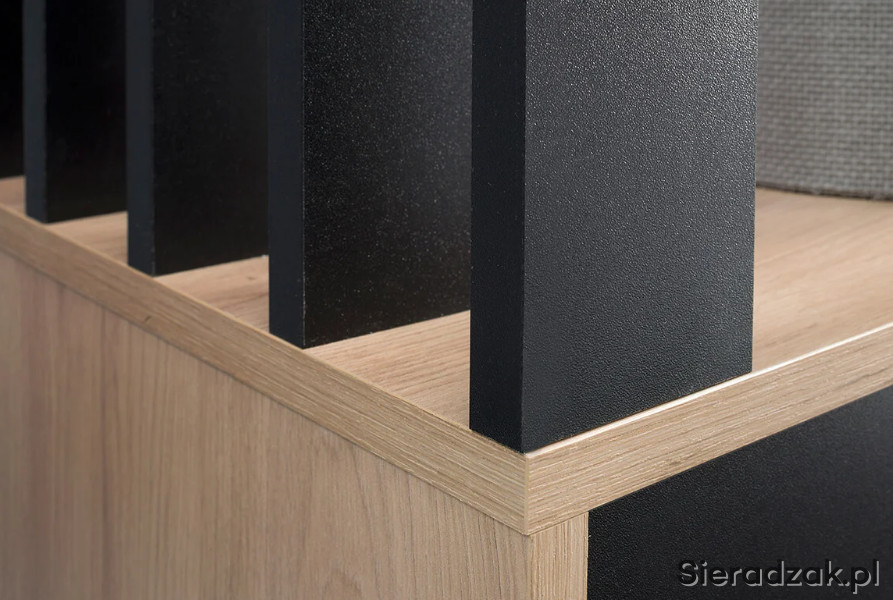 Garderoba to mebel, który potrzebny jest w każdym domu, to funkcjonalna szafa do przechowywania butów i odwieszenia kurtek na wieszaku. Nie może w niej zabraknąć lustra, w którym będziemy mogli się przejrzeć przed wyjściem z mieszkania. Nowoczesny wygląd sprawia, że garderoba wpasuje się w modowe trendy tego sezonu. Za drzwiami z lustrem znajdują się półki, które można wykorzystać do schowania obuwia dla całej rodziny. Garderoba dostępna jest w dwóch wersjach kolorystycznych: cała w kolorze Artisan i w kolorze czarnym w połączeniu z ciepłym, naturalnym Artisanem. Garderoba będzie pasować do każdego holu, jest uniwersalna, ozdobne lamele mogą być po prawej, jak i po lewej stronie. Wieszak i uchwyty są bardzo solidne i wykonane z metalu.