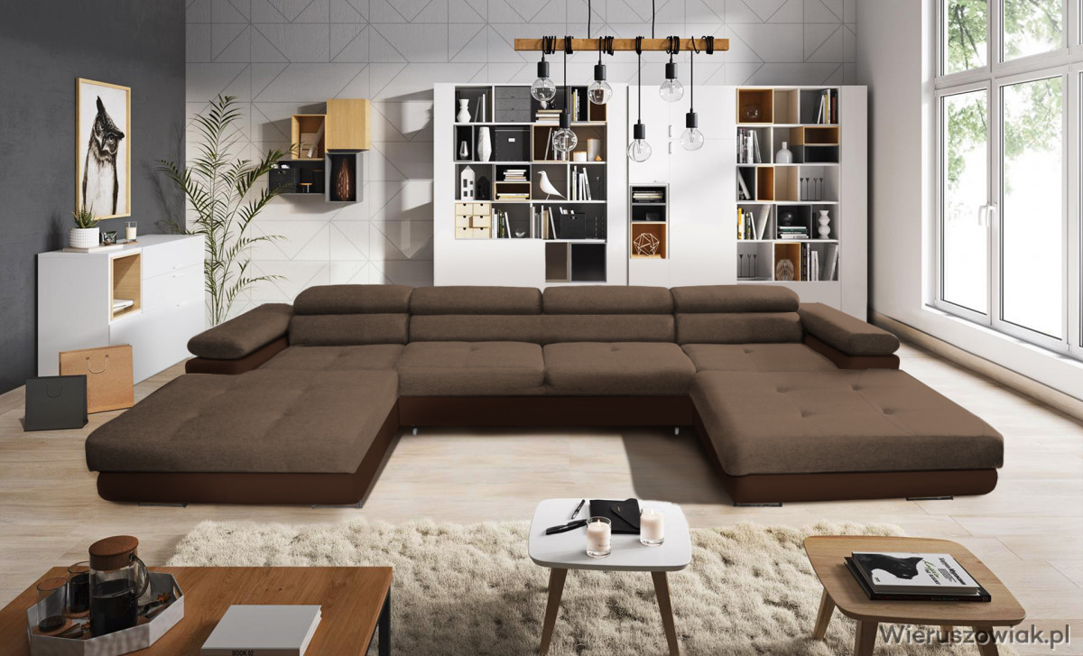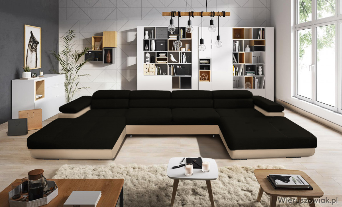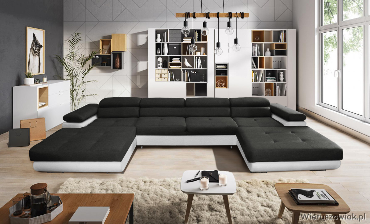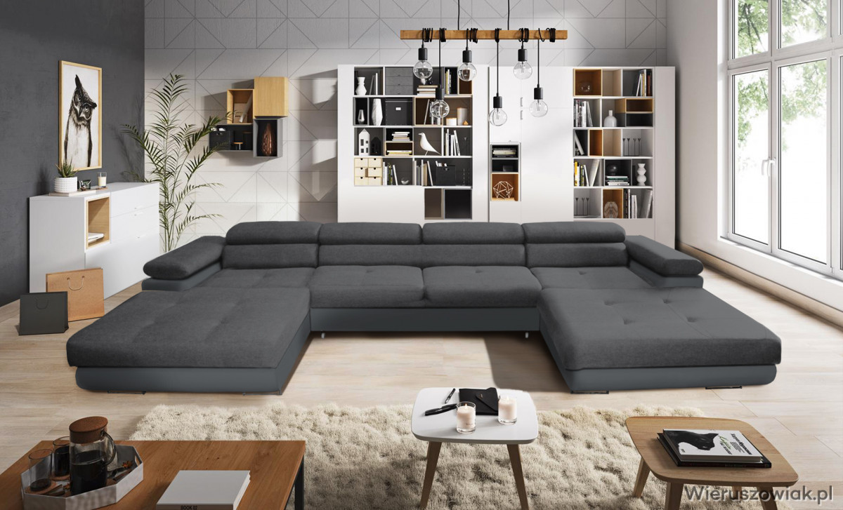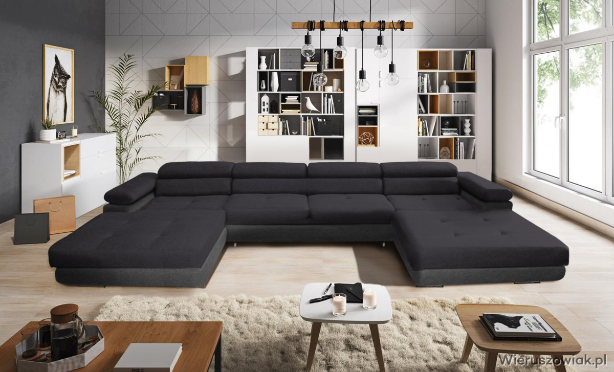 Duży nowoczesny narożnik Anton w kształcie U to idealny wybór dla osób szukających komfortu i stylu. Jego nowoczesny design wyróżnia się eleganckimi liniami oraz funkcjonalnością. Narożnik wyposażony jest w dwa pojemniki na pościel, umieszczone w otomanach, co pozwala na wygodne przechowywanie dodatkowych tekstyliów.
