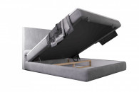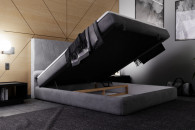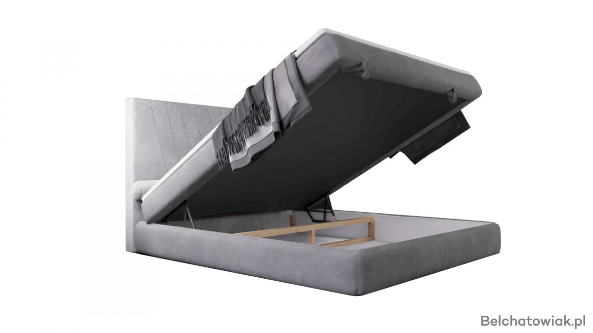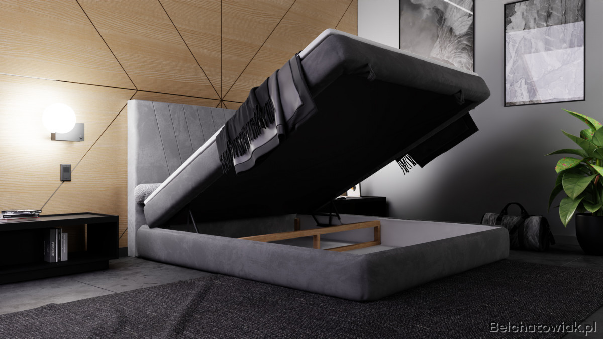 Dolna część łóżka skrywa obszerny pojemnik na pościel, otwierany od przodu. To praktyczne rozwiązanie, które ułatwia przechowywanie koców, poduszek czy kołder i pozwala utrzymać porządek w sypialni.