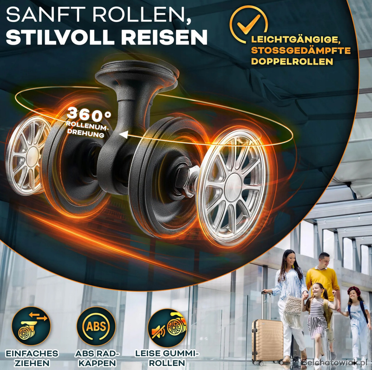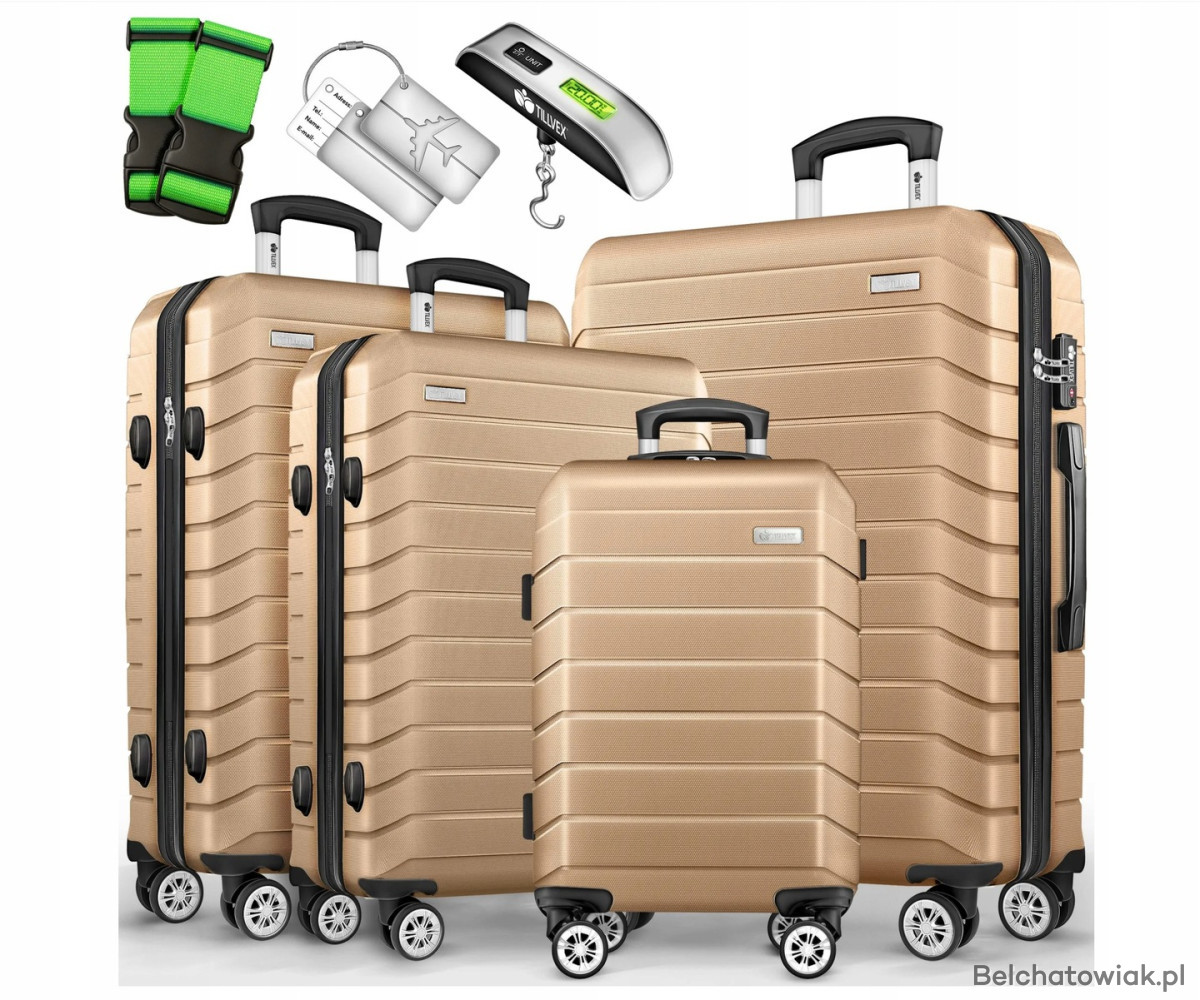 Kompletny zestaw walizek podróżnych z kółkami – 4 elementy, wykonany z trwałego ABS z zamkiem TSA.